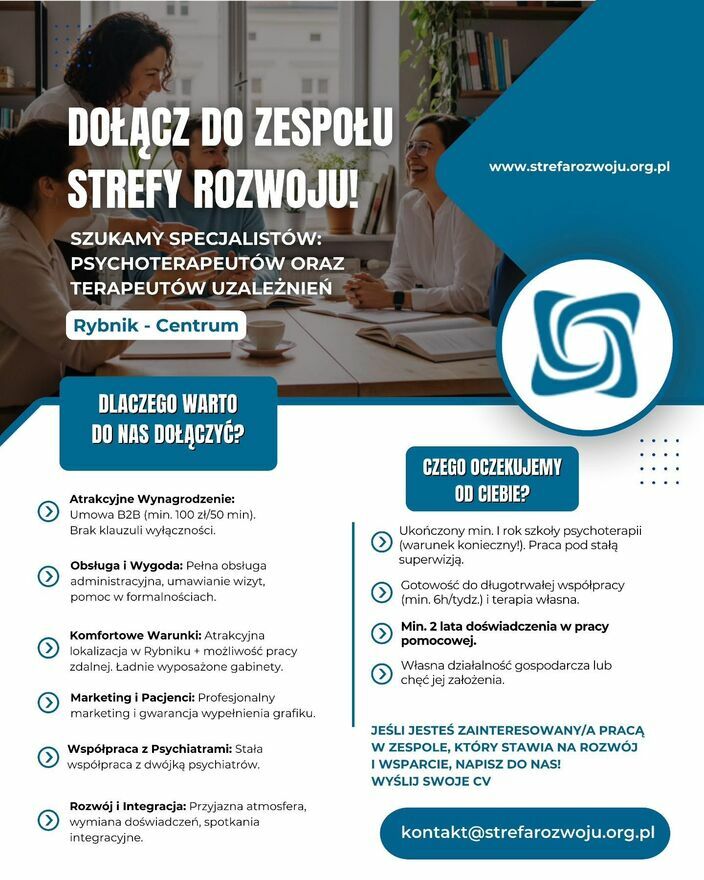 Ośrodek Psychoterapii Strefa Rozwoju w związku z ciągłym rozwojem zaprasza do współpracy PSYCHOTERAPEUTÓW będących jednocześnie najlepiej psychologami. Działamy na rynku od 2014 roku. Tworzymy miejsce pracy dla entuzjastów, którzy podzielają naszą misję pomagania ludziom, nawet w najtrudniejszych sytuacjach związanych ze zdrowiem psychicznym. Zależy nam na ich kompleksowym wsparciu stąd nacisk na kompleksowość oraz współdziałanie naszych specjalistów.Do naszego Ośrodka w centrum Rybnika poszukujemy specjalistów zajmujących się psychoterapią dorosłych, dzieci i młodzieży oraz rodzin. Także terapeuty uzależnień.