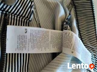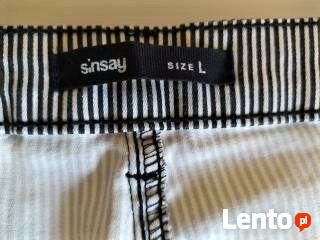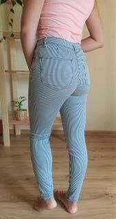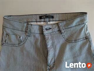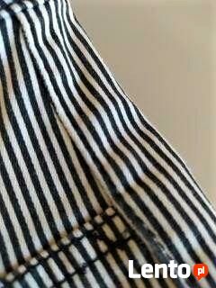 Sprzedam oryginalne spodnie, z wysokim stanem, w delikatne biało- czarne paseczki.Normalny wysoki stan, ładnie wymodelowana figura z przodu zamek i guzik.