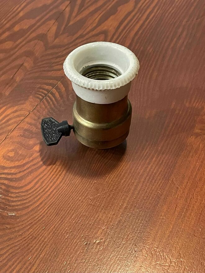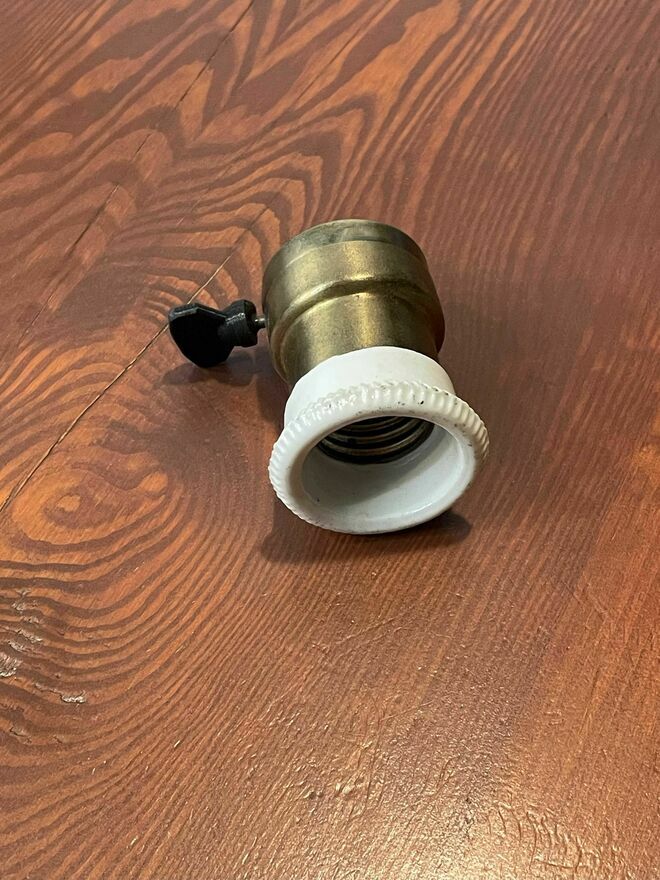 Stara oprawka mosiężna z porcelanką i wyłącznikiem żarówki E27