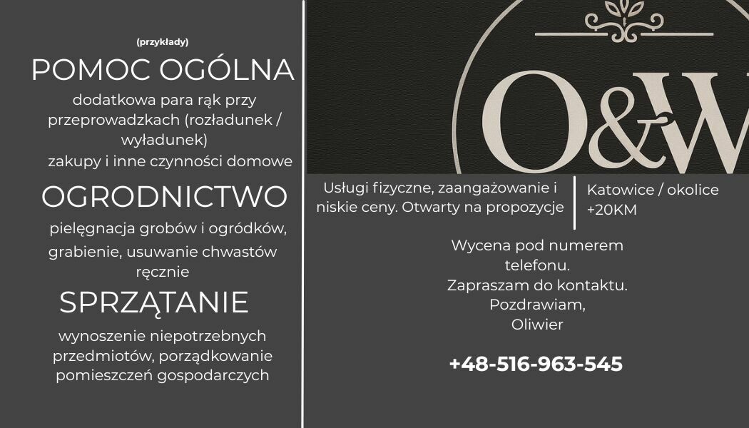 Oferuję zlecenia fizyczne za drobną opłatą pracuję sumiennie z pełnym zaangażowaniem i chęcią do pracy nie boję się żadnych wyzwań jestem otwarty na propozycje i dotrzymuję terminów.Oliwier