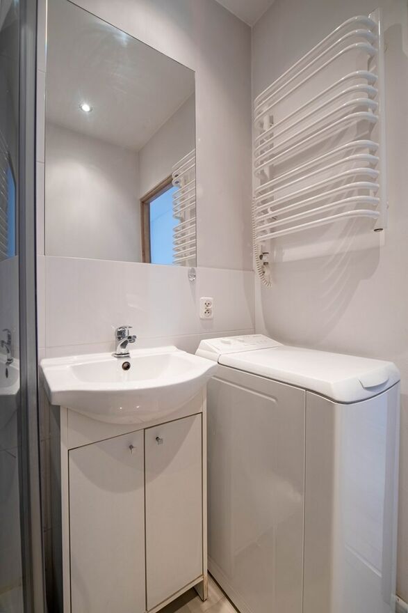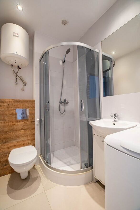 Łazienka: kabina prysznicowa, umywalka, pralka oraz WC.