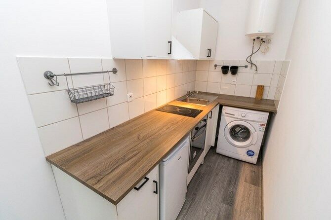 Kuchnia: kuchenka elektryczna, lodówka i pralka.