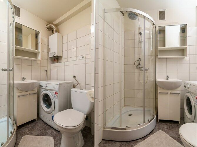 Łazienka: kabina prysznicowa, umywalka z szafką, lustro, pralką