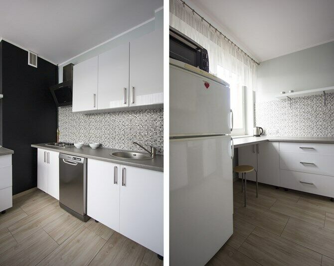 Aneks kuchenny: szafki, płyta gazowa, piekarnik, lodówka, zmywarka.