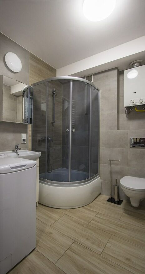 Łazienka z WC: pralka, kabina prysznicowa, umywalka, szafka, lustro.
