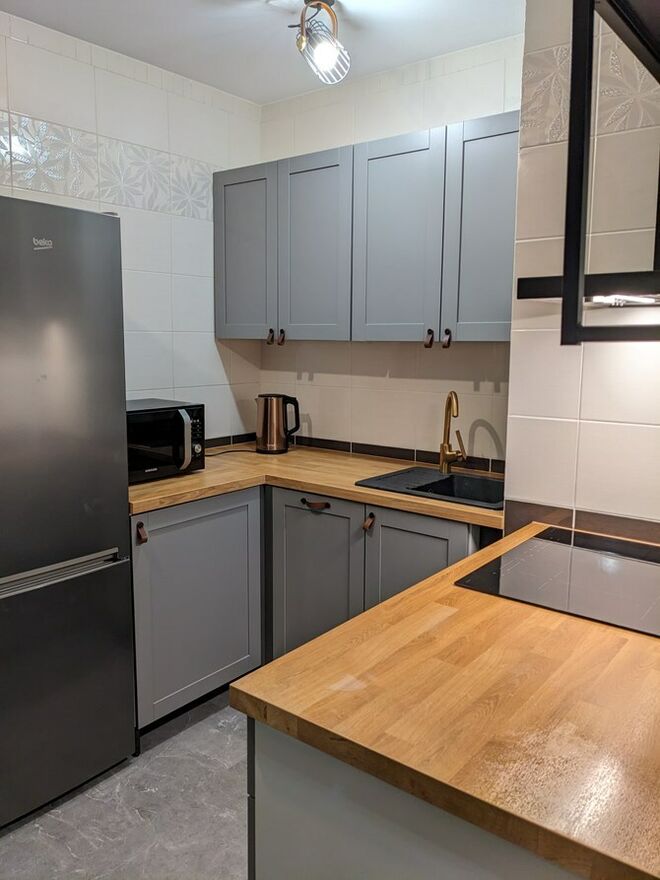 Kuchnia: szafki, płyta indukcyjna czteropalnikowa, lodówka,