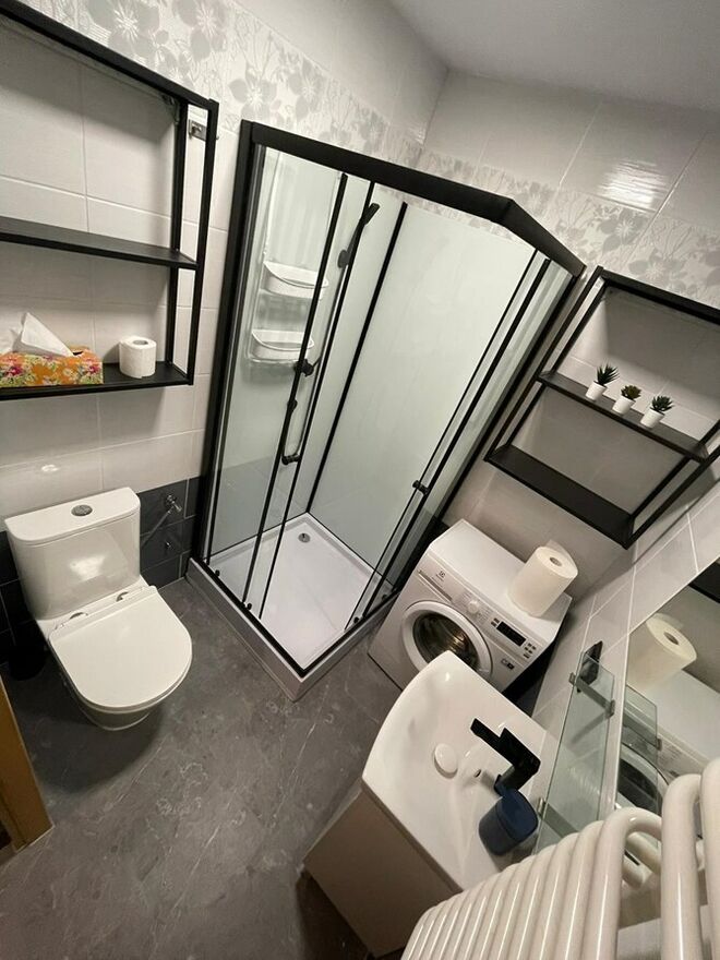 Łazienka (z WC): kabina prysznicowa, umywalka, szafka, lustro,