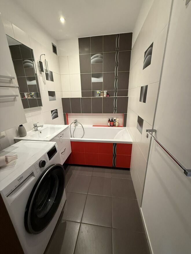 W pełni umeblowane i wyposażone w sprzęt AGD ( kuchnia : płyta indukcyjna, okap, zmywarka, piekarnik , lodówka, łazienka: pralka)