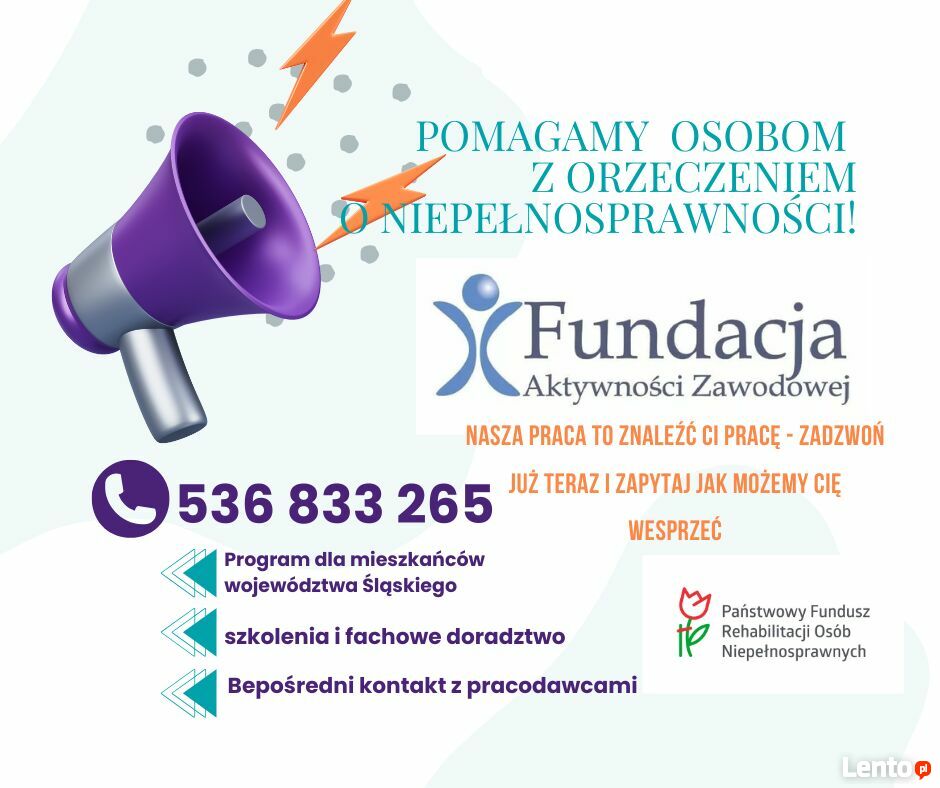 Od kilkunastu lat skutecznie i z pasją działamy w imieniu i na rzecz osób z niepełnosprawnościami. Zapraszamy - umów się na spotkanie i zobacz, że możemy Ci pomóc w znalezieniu pracy takiej jakiej potrzebujesz. Wspieramy zarówno osoby w poszukiwaniu pierwszej pracy, jak i te które potrzebują ją znaleźć w starszym wieku. Pomagamy między innymi prawnikom, kwiaciarkom, ochroniarzom, osobom z doświadczeniem i bez. Jeśli tylko jesteś mieszkańcem województwa śląskiego zadzwoń.Sprawdź zainteresowanie tym ogłoszeniem